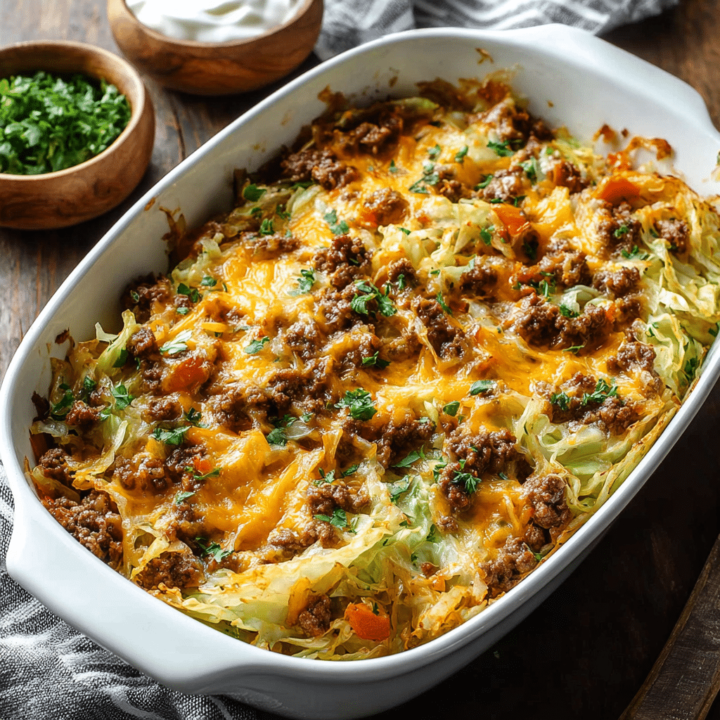 Cooking the cabbage briefly before baking helps improve texture and flavor.Ground turkey or ground chicken can replace ground beef for a lighter version.For a low-carb option, replace the rice with cauliflower rice.Additional vegetables like carrots, bell peppers, or zucchini can be added for extra nutrition.Allow the casserole to rest before serving so it slices more easily.