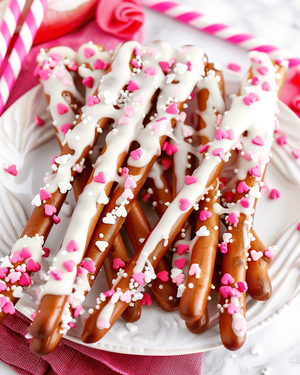Valentine’s Pretzel Rods are festive, chocolate-dipped pretzels decorated with colorful sprinkles and candy for the perfect sweet-and-salty Valentine’s Day treat. Easy to make and fun to decorate, they’re great for gifting or serving at parties.