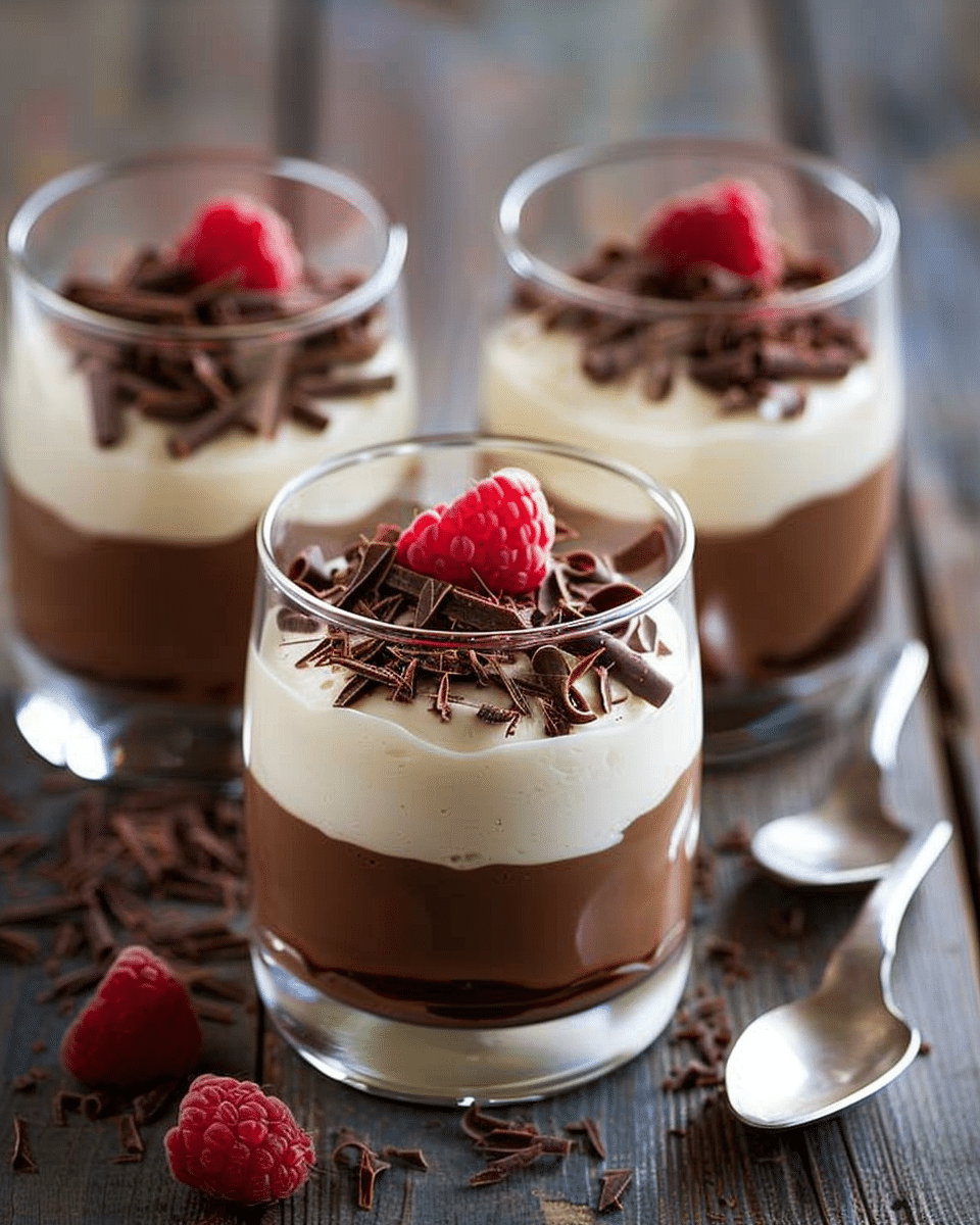 Layer the mousse and chocolate: Spoon the vanilla mousse into serving glasses, filling them about two-thirds full. Then, gently spoon or pour the cooled chocolate layer on top of the mousse.